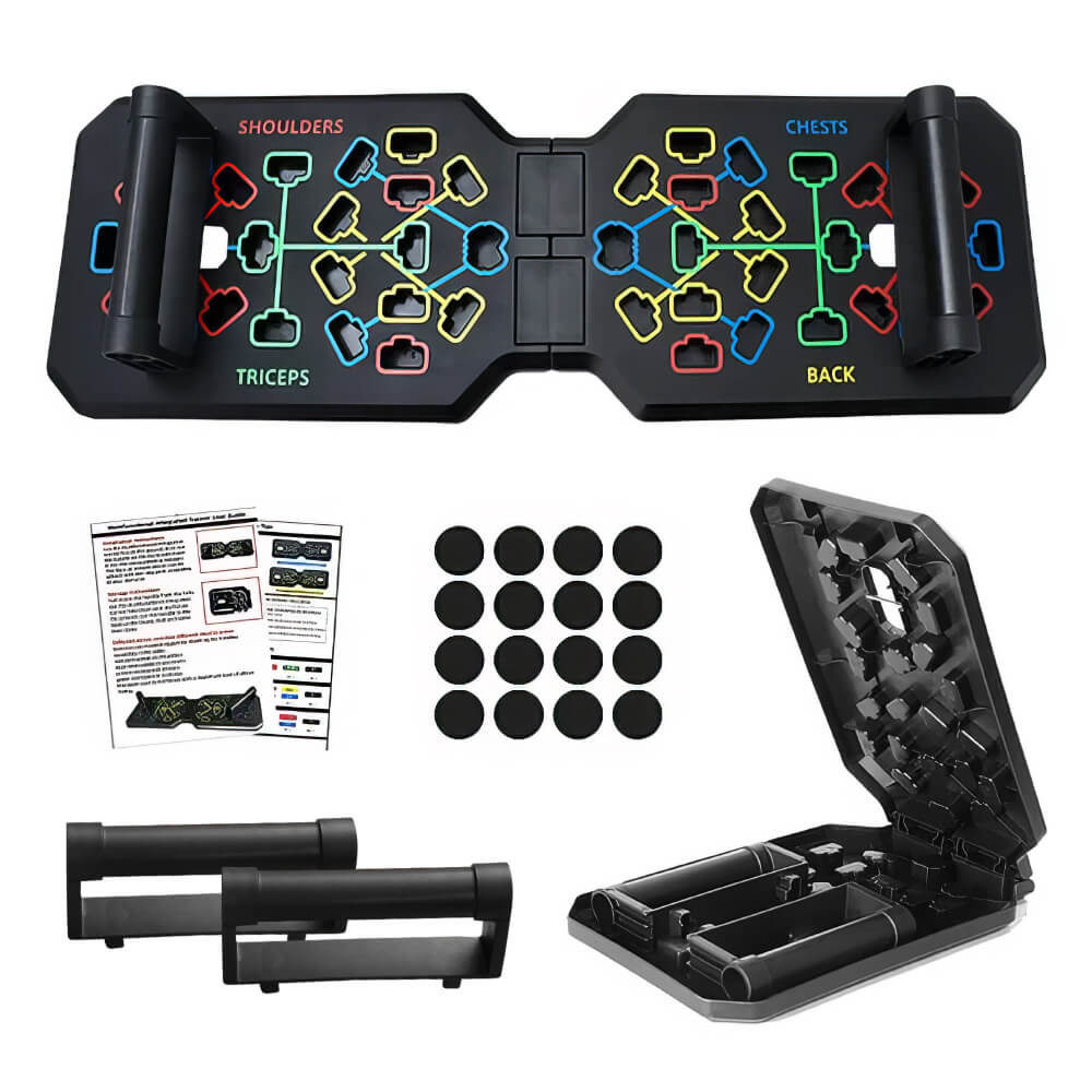 This push-up training board is designed to support strength and resistance exercises. It helps engage multiple muscle groups such as the chest, triceps, shoulders, and back. The board features a foldable and lightweight design for easy storage and portability, making it suitable for home or travel use. Foam-cushioned handles provide comfort and reduce joint strain, while the durable ABS construction supports up to 600 lbs of weight for reliable performance.